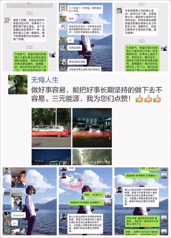 三元人懷揣著激動而又心安的心情,此屆愛心***公益活動***結束在此,也感謝所有三元能源的家人們,謝謝你們這兩天辛勤地的付出,同時讓每一位三元人也切身體會到的更多的是滿滿的感動和愛。兩天雖短,卻讓我們收獲頗豐,更得到了社會各界的支持和贊譽,尤其是來自考生和家長發自肺腑的感謝和真摯的祝福期間所有感動的瞬間,大愛的流露太多太多!期間我們遇到了一位家長,她的一雙兒女,兩年都是分別被我們車隊接送,今年是她的女兒;我們一大早六點就起來在新鄉市公交站牌、小區門口等候接送,家長知道我們起得早,第二天考試直接給我們準備了一大袋的鹵雞蛋,說句心里話,這一次是我們吃過***好吃的鹵蛋…等等…太多太多的感人事跡和關于愛和緣分的故事很慶幸擁有三元能源這個大家庭,也很慶幸每一位三元人都能真正靜下心來去踐行這份公益事業,同時我們三元能源公司更會堅定不移地把這份愛心公益活動傳承下去***后,祝愿所有2017年的高考生們:愿你們合上筆蓋的那一刻,有武士將刀收回劍鞘般的驕傲未來,我們一起加油!